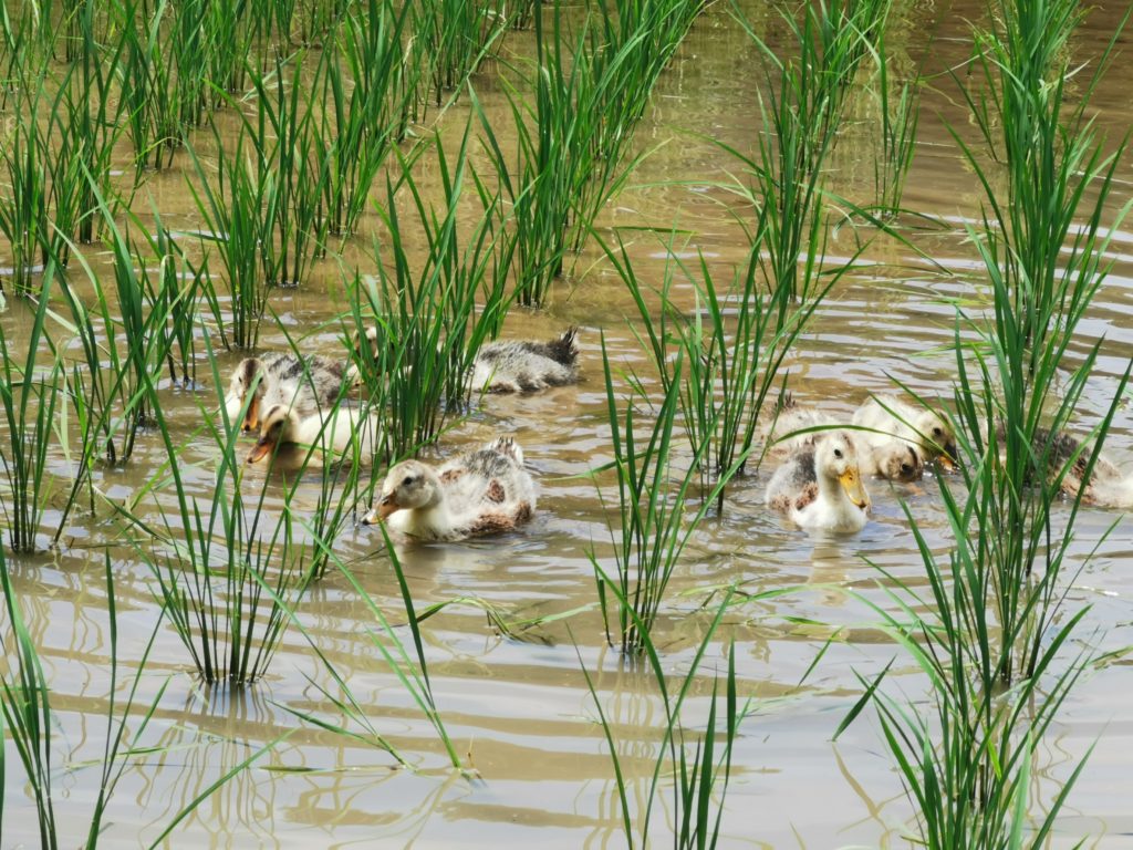 10kmに及ぶ山の用水から水を引き、5 月には田植え、除草対策としてアイガモたちを放ち、6 月7 月と、水管理、法面の草刈り、対イノシシ電気柵設置をすべての田んぼでおこないます。