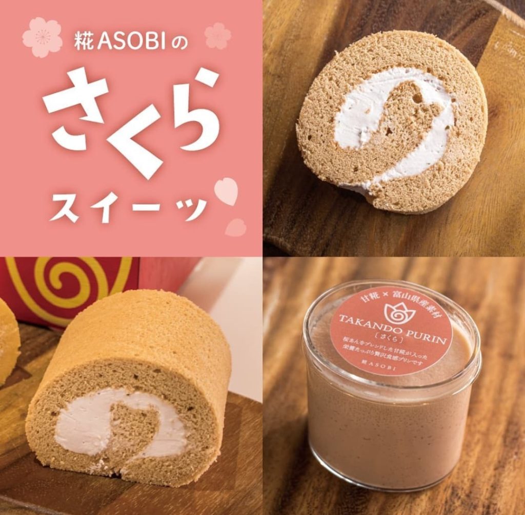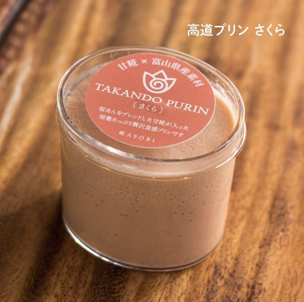 富山県産の厳選素材と、日本古来の米麹を使って身体に優しいお菓子を作っています。ここでは、高道プリンに土遊野の低温殺菌アデア牛乳を使っていただいています。上層はなめらかプリン、下層はあまこうじのプリンで二層になっています。季節に応じて、色んな味を出していて、今は春限定のさくら味が販売されています。他にも、看板メニュー高道ロールもおすすめです。よかったら、食べてみてくださいね。