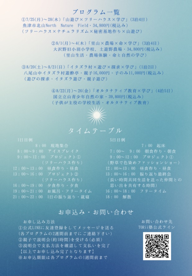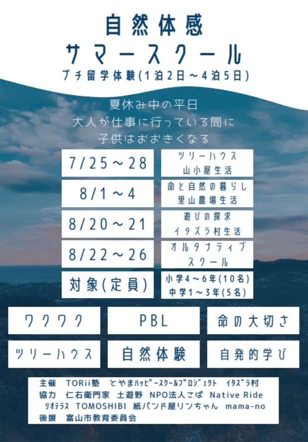 地域密着型・自立学習塾TORii塾さん、オルタナティブスクールを運営しているとやまハッピースクールプロジェクトさん、NPO法人富山・イタズラ村・子ども遊ばせ隊さん主催の夏休みプチ留学体験が開催されます。