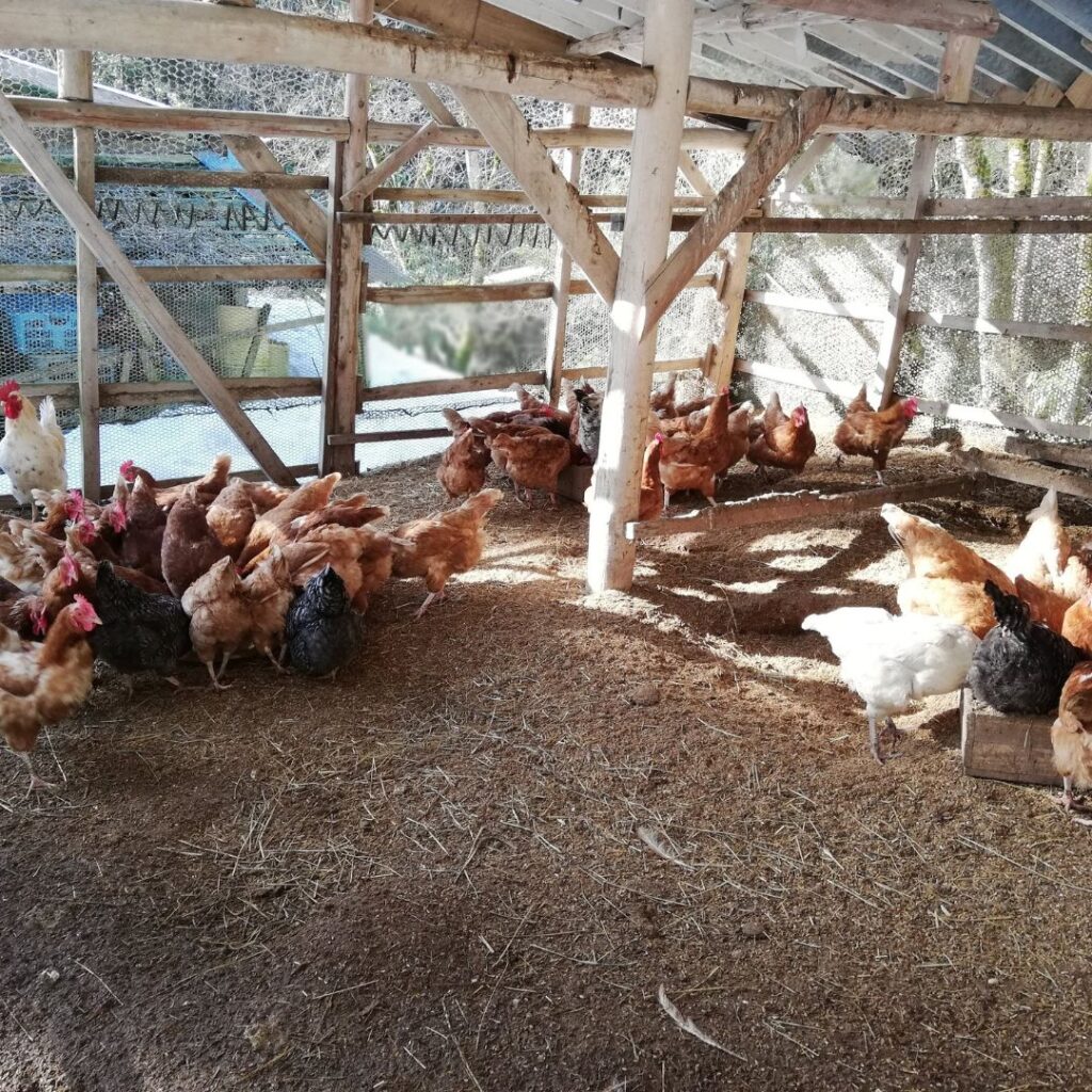 土遊野の鶏たちは毎日土の上を駆け回る平飼いという飼い方で育っています。100羽のメス鶏に1~2羽のオス鶏も一緒にいます。有精卵は50~70%ほどです。土の上を駆け回り、くちばしでエサや土をつつき、なるべくストレスをかけずに元気に生きてもらうことが、良い卵を産んでもらえるのに一番大切だと考えています。土に身体をうずめて砂浴びをし全身で体温調節したりミネラル補給したりしています。そしてその毎日鶏たちにかき混ぜ切り替えしてもらった床は、そのまま「発酵鶏糞堆肥」として田畑に使わせてもらっています。 平飼いの良いところは、鶏たちが元気に生き、その結果抗生物質やワクチン接種も 必要なく、安心安全を食べる方に届けられる!そして鶏糞堆肥を作ってもらえるのです。 良いことばかりですが、なぜ日本ではみんな平飼いしないのだろう。。。 私はすぐに疑問に思いました。これば「奮闘記へ続く(裏面へ)」