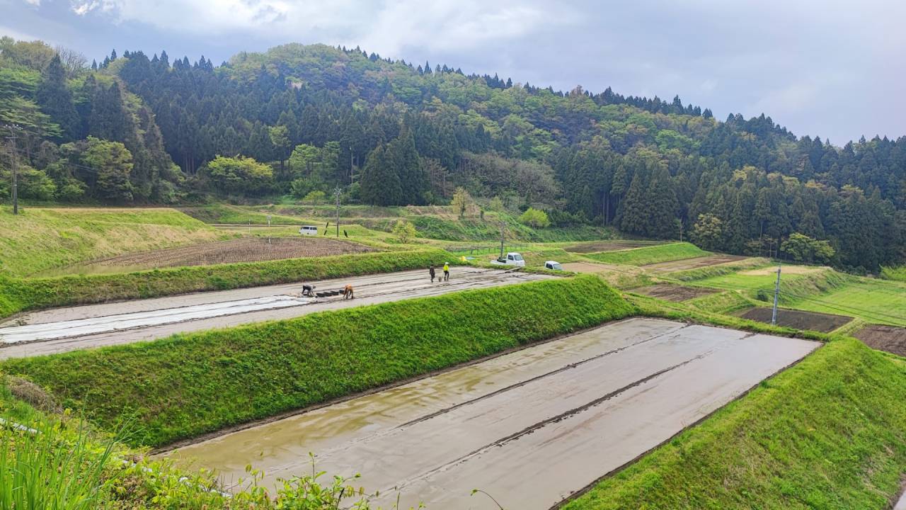 下の写真は、棚田の苗場で「床ならべ」という作業をしています。